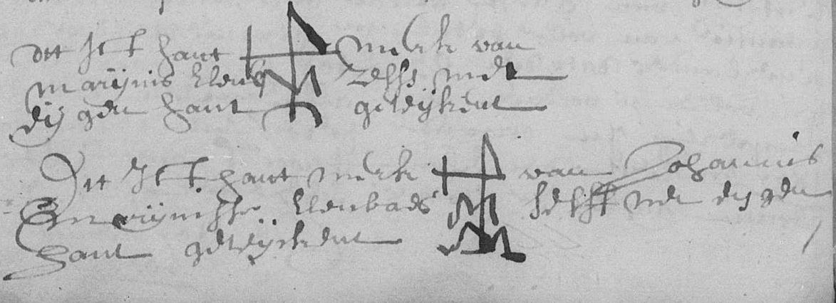 ![]() | 16 jan. 1676 transport huis onder de Mooldijk (transport 18-06) (f. 43v) [akte gezien] bron: GAT_035_5901 Marinus Elenbaas (1616 - 1693) verkoper, aan zoon, fl 462,50; handmerk Johannes Elenbaas (1651 - 1692) koper, van vader; handmerk Lena / Leente Speelman (1634 - 1688) boven op de prijs 2 ducatons voor haar, als Leenken zijn vaders vrouw |